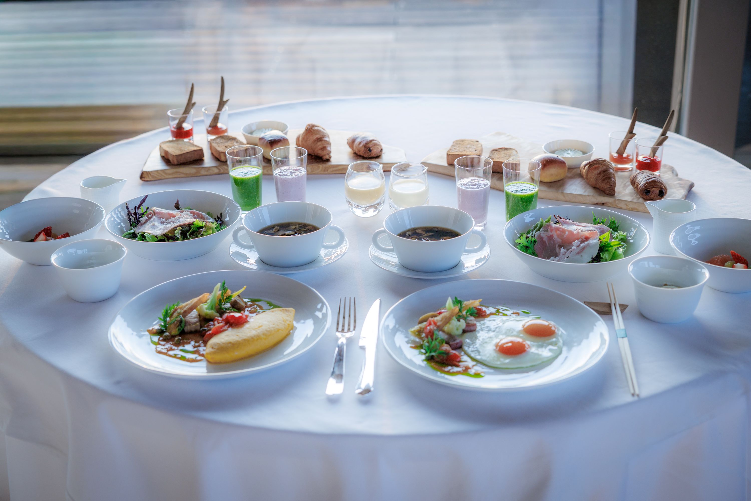 SENVIEスタイルの朝食で、ダイニングの窓いっぱいに広がる大和三山を眺めながら、やすらぎのひと時をお過ごしください。